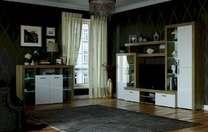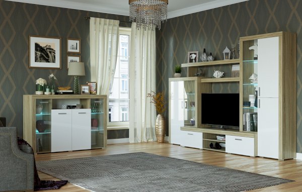 Гостиная «Орландо» опционально может комплектоваться светодиодной подсветкой стеклополок витрин. Фасадная часть гостиной подчёркнута стильными планками МДФ, представляющими собой элементы корпуса и фасада.