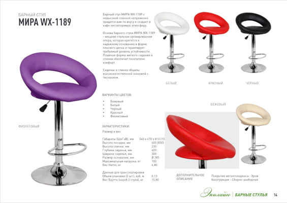 Популярный барный стул МИРА WX-1189 с невысокой спинкой непременно придется вам по вкусу и создает в кафе неповторимую атмосферу. Основа барного стула МИРА WX-1189 - мощная стальная хромированная опора, которая крепится к надежному основанию в форме плоского диска и гарантирует требуемый уровень устойчивости. Плавные формы мягкого сидения и спинки обеспечат посетителю комфорт.