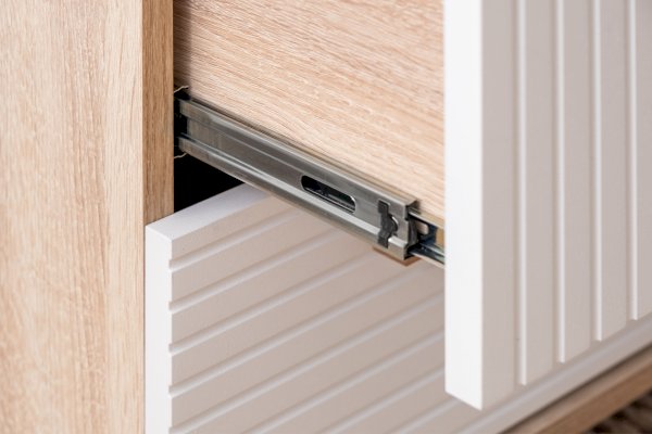 Створки крепятся на петли с доводчиками для плавности хода. Конструкцией предусмотрен механизм открывания створок «push-to-open». Ручки ящиков из натурального массива дуба.