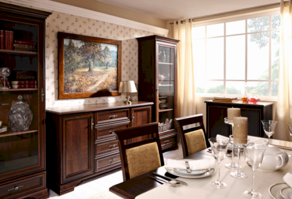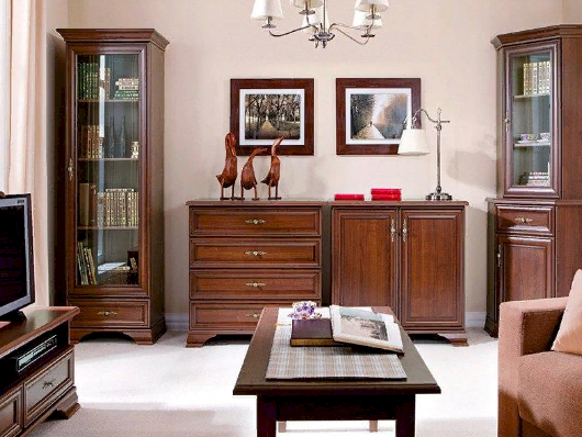 Кентаки - мебель классического стиля, отличающаяся природными цветами, отделкой, фактурой, всегда актуальна и востребована, она настолько универсальна, что без проблем впишется в любой современный дизайн. Стиль набора модульной мебели подчеркивается лакированной патинированной планкой в фасадах, карнизами - завершающим акцентом в зеркалах и высоких элементах набора, витиеватыми ручками.