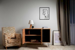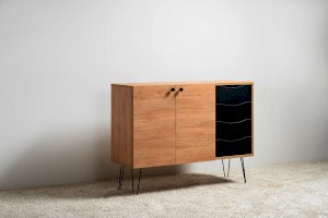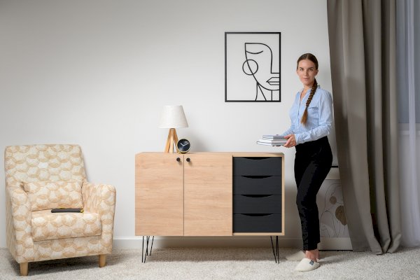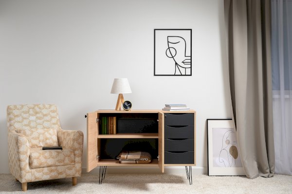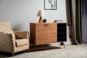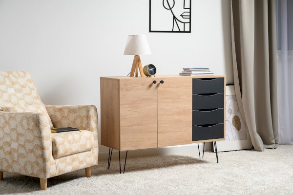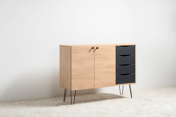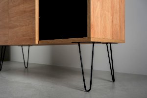 Лаконичный и стильный комод Брюс на высоких металлических опорах будет уместен в интерьере современной гостиной, спальни, прихожей.