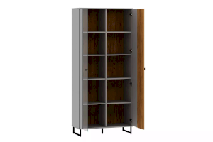 Коллекция БРУНО – это современный дизайн с характером, который отлично впишется в стиль лофт. Цвет платиново-серого и золотого дуба гармонично подчеркнут контрастными элементами – стеклом в витринах, черными ручками и черными металлическими опорами.