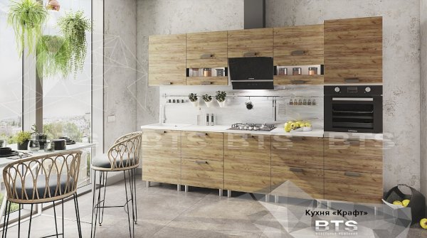 Фактурный древесный декор фасадов кухни "Крафт" отсылает к природной естественности и грации, а черные элементы создают яркие акценты, привлекающие к себе внимание. Четкие геометрические линии, массивные ручки под металл и фасады под дерево помогают отступить от стандартных шаблонов оформления кухонного пространства, обустроив у Вас дома воплощение изящества и элегантности!