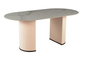 Столешница из керамики отличный вариант для кухни. Материал знаменит прочностью и долговечностью, поверхность устойчива к различным внешним воздействиям. Поверхность столешницы с рисунком белого мрамора гармонично сочетается с массивными ножками бежевого цвета. Простая овальная форма стола позволит легко вписать его в современный интерьер, стол украсит кухню, гостиную или современное кафе, ресторан. Опорные плиссированные ножки в лаконичном дизайне надёжно удерживают всю конструкцию и дополняют монолитный образ.