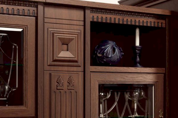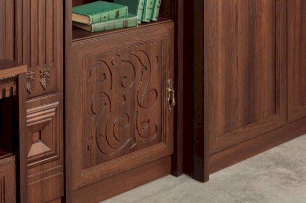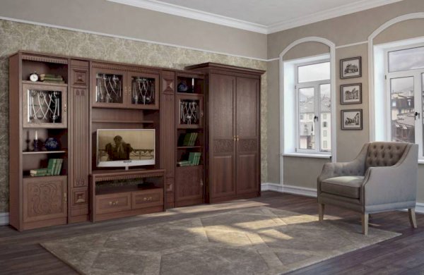 Классическая серия «Лючия» включает 12 модулей для гостиной и кабинета.  Запоминающийся облик коллекции «Лючия» обеспечивают оригинальные дизайнерские приёмы: торцевые и внутренние модули-колонны, сложная радиусная гравировка и фигурная фрезеровка в сочетании с объемными декоративными элементами. Мебель оснащена надежной немецкой фурнитурой «Hettich» и роскошными итальянскими ручками подсостаренное золото, что является несомненным плюсом ко всем ее достоинствам.