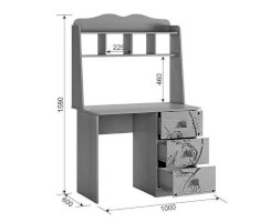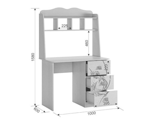 Стильный и модный стол детской «Фэнтези» - обрадует каждого ребенка. Компактный стол прекрасно впишется даже в маленькое пространство детской комнаты. Удобная столешница подойдет как для письма, так и для занятий на компьютере или ноутбуке. Открытые полки надстройки стола хорошо подходят для хранения учебников и школьных принадлежностей. В 3-х выдвижных ящиков поместится все, что необходимо для учебы и творчества. Необычный принтерный рисунок на фасадах выдержан в общем стилистическом решении. Рисунок устойчив к истиранию и ультрафиолету.