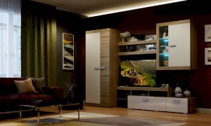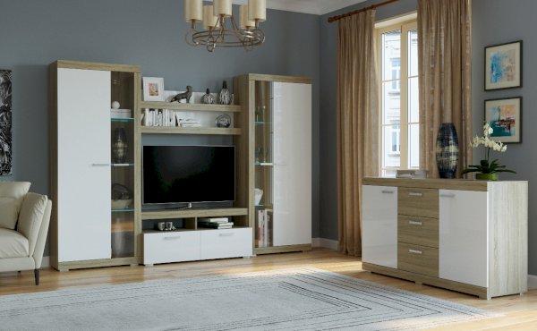 В гостиной Соната применяются современные европейские декоры: корпус выполнен из ЛДСП Дуб сонома, фасад из ЛДСП Белый глянец. Декоры отличаются выраженной тёплой древесной текстурой, а фасадная часть подчёркнута горизонтальными линиями текстуры и стильными планками МДФ, представляющими собой элементы корпуса и фасада.