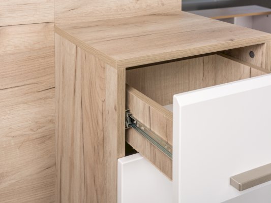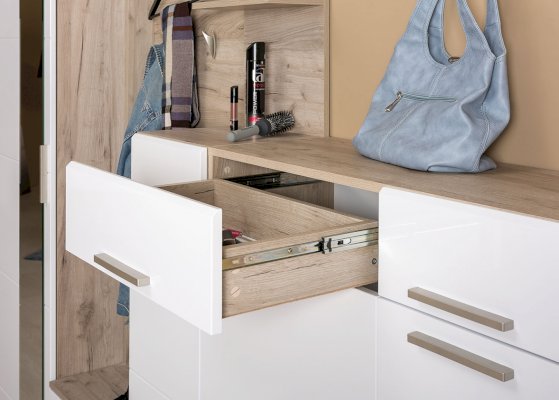 Фурнитура: Пластиковые обувницы, выдвижные ящики на шариковых направляющих полного выдвижения, пластиковые ручки.