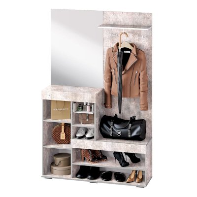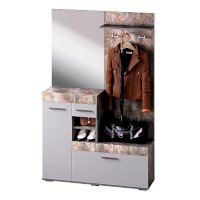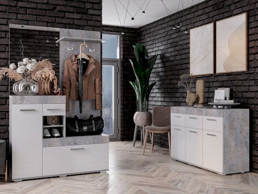 Небольшая, но стильная модель Инстайл станет прекрасным выбором для решения хранения в прихожей. Сочетание белого матового и фактуры бетона, а также наличие большого зеркала облегчают конструкцию и позволяют ей расширить пространство. Все створки, за которыми спрятаны полки для хранения вещей и обуви, оснащены эргономичными хромированными ручками.