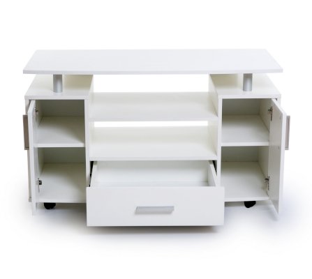 Удобная телевизионная тумба с открытыми полками для аудио/видео-аппаратуры, закрытыми полками и вместительным выдвижным ящиком.