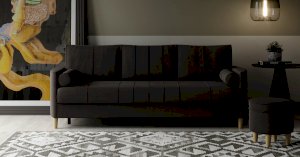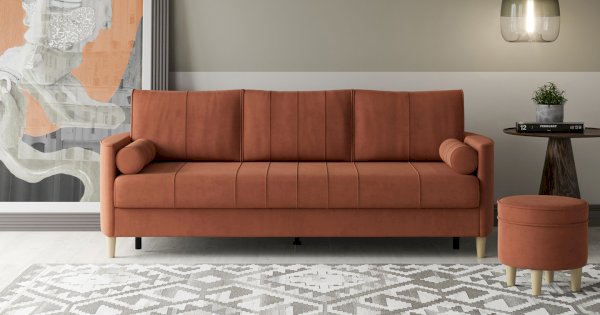 Комплект состоит из прямого и углового диванов, кресла для отдыха и пуфа.