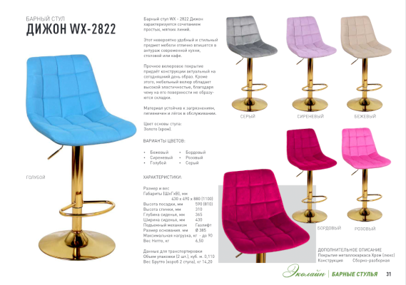 Барный стул ДИЖОН WX-2822 со спинкой непременно придется вам по вкусу и создает в кафе неповторимую атмосферу. Основа барного стула ДИЖОН WX-2822 - мощная стальная хромированная опора, которая крепится к надежному основанию в форме плоского диска и гарантирует требуемый уровень устойчивости. Сиденье стула изготовлено из экологически чистой гнутоклееной фанеры и обтянуто тканью с применением пенополиуретана различной толщины. Мягкие формы стеганого сиденья обеспечат посетителю комфорт.