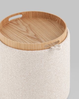 Мягкий пуф с ящиком станет незаменимым украшением интерьера. Он не только удобный, но и функциональный. Благодаря двухсторонней крышке, пуф можно трансформировать в журнальный столик. Столешница выполнена из светлого дерева с бортиками по краям и вырезными ручками для удобства, и безопасности при использовании. Крышка пуфика полностью съемная и при необходимости её можно использовать как поднос. Полезное дополнение - ящик для хранения различных мелочей, внутри обит тканью. Компактный и вместительный, такой пуфик наполнит пространство особым уютом и теплом. Подойдет для любого интерьера - как в классическом стиле, так и в современном.