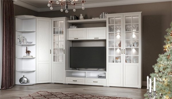 Функциональная стенка Лацио создана для тех, кто ценит комфорт, уют и эргономику. Сочетание белоснежного цвета и стеклянных фасадов визуально расширяет пространство, добавляет света и лёгкости. Декоративными элементами стенки служат фрезерованные фасады из МДФ с текстурой дерева и фигурный карниз. В шкафу с прозрачными витринами будет идеально смотреться красивая посуда. Тумба для ТВ с открытыми и закрытыми полками разместит приставки, медиа устройства. Система Лацио состоит из множества отдельных модулей, благодаря чему можно легко подобрать мебель для комнаты любого размера и нужного вам функционала.