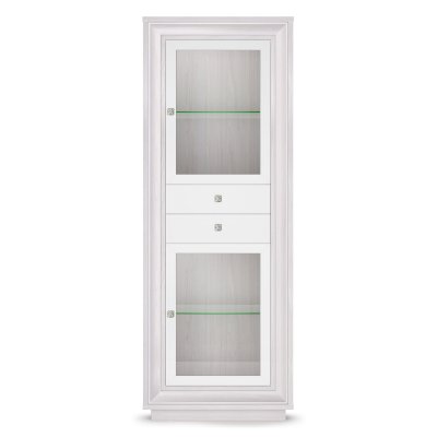 Данный модуль имеет очень удобную и вместительную конструкцию для открытого хранения за прозрачным стеклом всевозможных красивых вещей. Благодаря наличию двух отделений со стеклодверью здесь вы сможете поместить большое количество посуды, фужеров, статуэток, ваз и обустроить бар. Каждая ниша за стеклянной дверкой обустроена стеклополкой из надежного стекла 6 мм. Уравновешивают и визуально делят витрину на 2 отделения 2 выдвижных ящика по центру, здесь можно закрыто хранить различные мелочи или аксессуары.