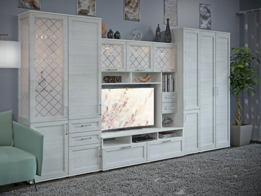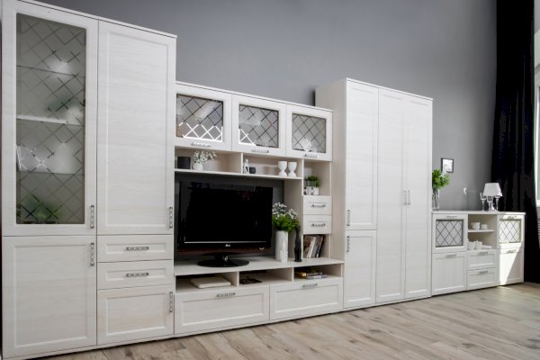 За закрытыми дверками расположены вместительные полки, два выдвижных ящика полного выдвижения, дополняют как внешний вид, так и добавляют дополнительную функциональность модулю.