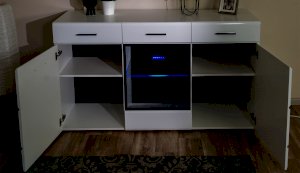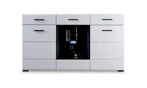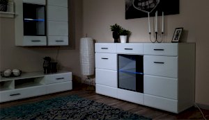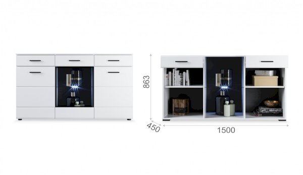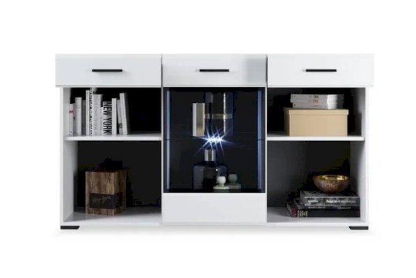 Белые глянцевые фасады МДФ и витрина с прозрачным стеклом сделают Вашу гостиную светлее и уютнее. Задняя стенка комода Йорк черного цвета красиво контрастирует с фасадами и корпусом белого цвета. Светодиодная подсветка сделает акцент на дорогих для Вас вещах, таких как фото, статуэтки или посуда. Комод оснащен всем необходимым для удобства использования, выдвижными ящиками на телескопических направляющих и закрытыми полками. Выполнен из экологически безопасных материалов.