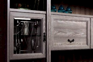 Фасады: МДФ, зеркало с фацетом, прозрачное стекло с фацетом и гравировкой; декоративные вставки с фигурной фрезеровкой: МДФ в пленке ПВХ с эффектом патины