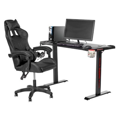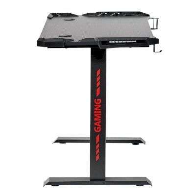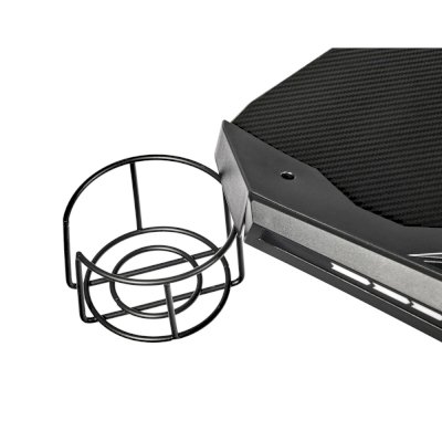 Поверхность стола не скользкая, устойчивая к загрязнениям, мелким царапинам. На столешнице можно расположить все необходимое: письменные принадлежности, документы, игровые девайсы, настольную лампу.  В конструкции предусмотрено 2 отверстия для проводов, а также подстаканник и крючок для наушников.