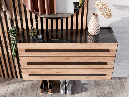 • Размер фасада ящика 1150х190 мм, глубина ящика 300 мм. На верхнем горизонте тумбы закреплено стекло черное 4 мм