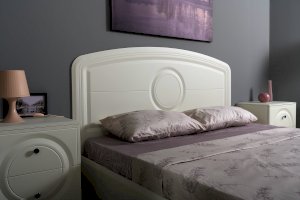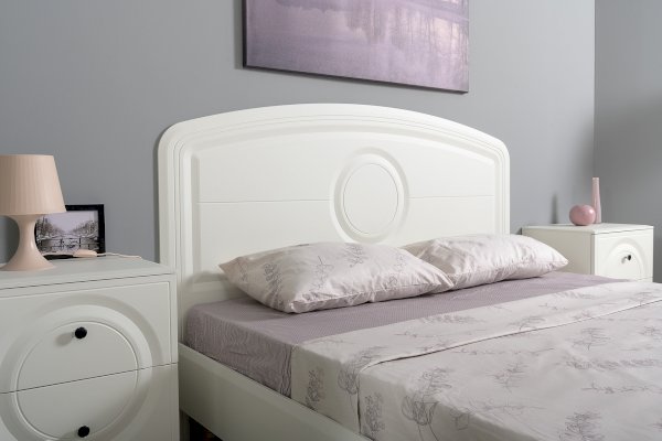 Кровать установлена на высокие ножки, что делает конструкцию лёгкой и воздушной, изголовье кровати декорировано фрезеровкой. Матрас укладывается на ортопедическое основание с гнутоклееными ламелями.