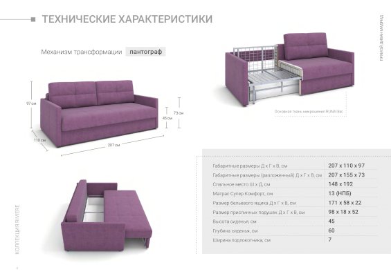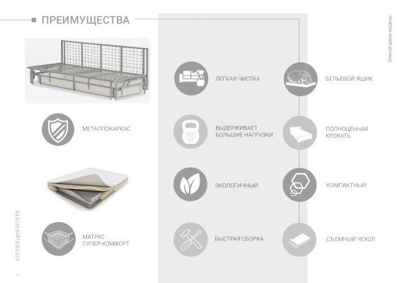 • механизм трансформации - пантограф – прочный и надежный, подходит для интенсивной эксплуатации. Распределенная нагрузка на спальное место 300 кг