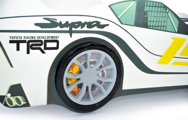 Каркас кровати выполнен из экологичного ЛДСП класса эмиссии Е1, соответствует всем стандартам качества. Кровать оборудована объемным бампером из ABS-пластика, к нему прилагаются наклейки в виде фар, радиаторной решётки и логотипа автомобиля. Все края кровати покрыты кромкой ПВХ 1 мм и безопасны для малышей.