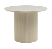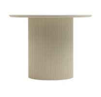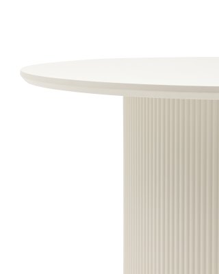 Столешница выполнена из прочного и долговечного МДФ. Светлая поверхность столешницы гармонично сочетается с массивной основой. Простая круглая форма стола позволит легко вписать его в современный интерьер, стол украсит кухню, гостиную или современное кафе, ресторан. Опорное плиссированное основание стола в лаконичном дизайне надёжно удерживает всю конструкцию и дополняют монолитный образ.