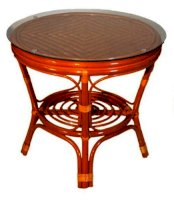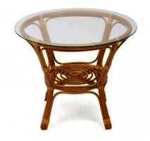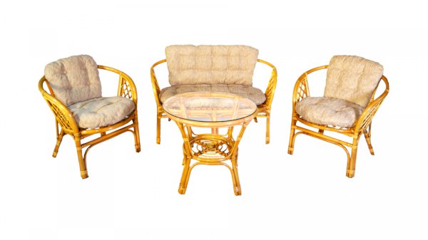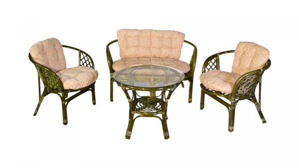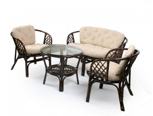 Комплект из натурального ротанга, состоящий из дивана, двух кресел и круглого столика со стеклом.