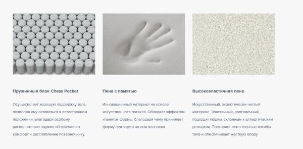 Состав: Турецкий трикотаж, стеганный на высокоэластичной пене и синтепоне Пена с эффектом памяти Белый хлопковый войлок Независимый пружинный блок ChessPocket Белый хлопковый войлок Пена с эффектом памяти Усиление по периметру матраса