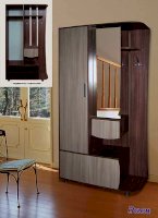 Прихожая «Элен» подходит для небольших помещений. Она компактна, но при этом весьма функциональна. В платяном шкафу и на открытой вешалке есть место для головных уборов и одежды, на полочках удобно хранить сумки и зонтики. Очень важная деталь — большое зеркало, в которое можно смотреться, прихорашиваясь перед выходом в свет.