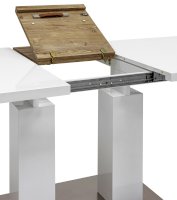 Обеденный стол раскладной. Столешница выполнена из прочного и долговечного МДФ. Светлая глянцевая поверхность столешницы гармонично сочетается с металлическими ножками. Простая прямоугольная форма стола позволит легко вписать его в современный интерьер, стол украсит кухню, гостиную или современное кафе, ресторан. Дополнительная вкладка стола выполнена из МДФ с бумажным шпоном цвета беленого дуба. На вкладке предусмотрена петля для комфортного открытия стола одной рукой.