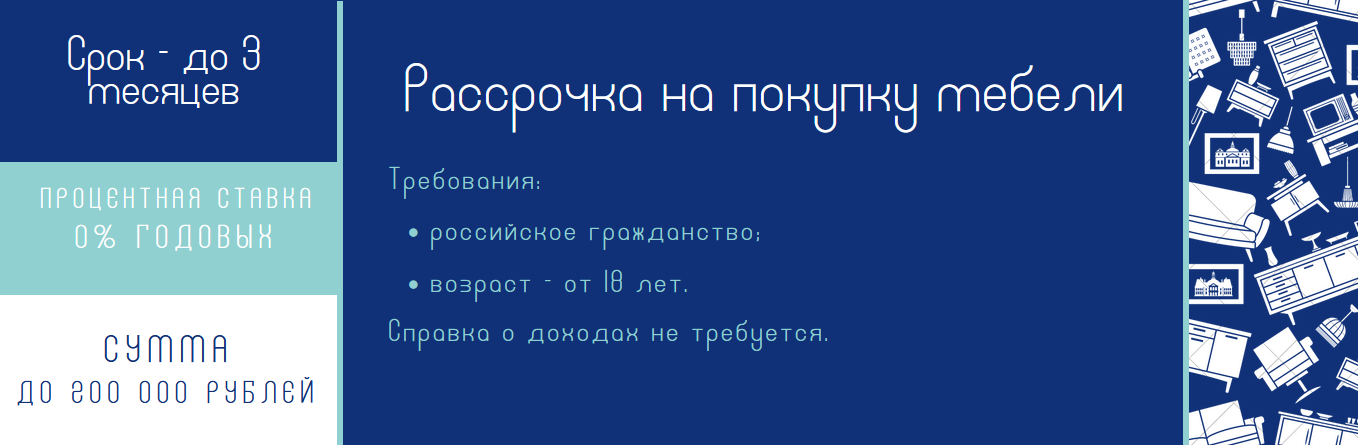 Купить в рассрочку можно мебель на общую сумму до 200 000 рублей одновременно. Минимальный размер — 3 000 рублей.